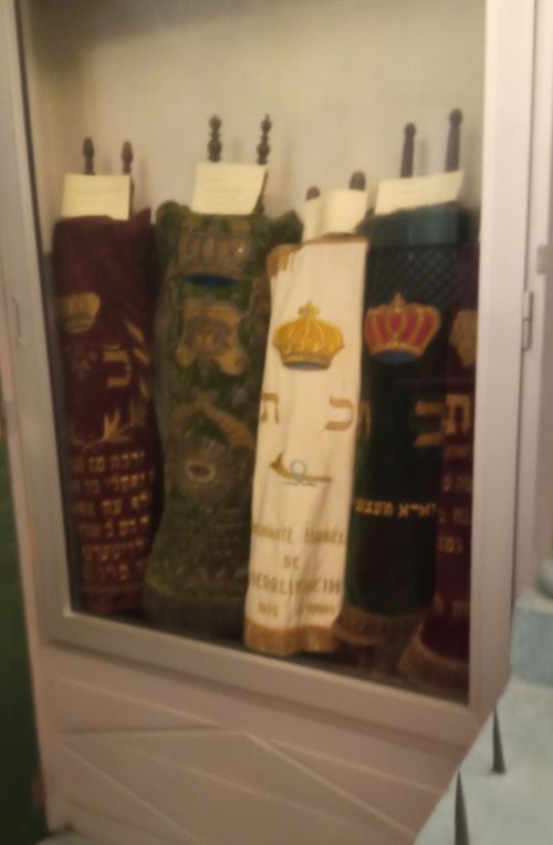et son bel encadrement d’arche sainte, décoré des lions de Juda et des vignes d’Alsace. Dans l’œil-de-bœuf, il y a des vitraux bleus et blancs qui selon le Talmud, permettent de déterminer l’heure matinale de la prière : lorsque le jour se lève, on parvient à distinguer les deux couleurs. Cette manière élémentaire de marquer le temps disparait au XIXe siècle avec l’apparition de la montre à gousset.