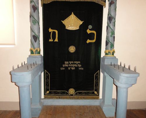 Dans le renfoncement d'un mur se situe l'arche sainte ou Aron Hakodesh. Son iconographie associe des éléments habituels de la tradition juive. L'encadrement en pierre se compose de colonnes enlacées de pampres qui supportent un linteau daté de l'année hébraïque 5551. Sur ce dernier sont aussi sculptés deux lions qui portent la couronne (fleurdelisée) de la Thora. De part et d'autre de cette représentation figurent des inscriptions en lettres hébraïques. Elles non plus ne sortent pas de l'ordinaire des synagogues alsaciennes: « L'Éternel est toujours en face de moi » et « Sache devant qui tu te tiens ». Le soubassement des colonnes présente deux avancées garnies de picots pour fixer des cierges. Les portes de l'armoire qui renfermait autrefois les rouleaux de la Loi sont cachées par un rideau d'Arche en velours brodé.