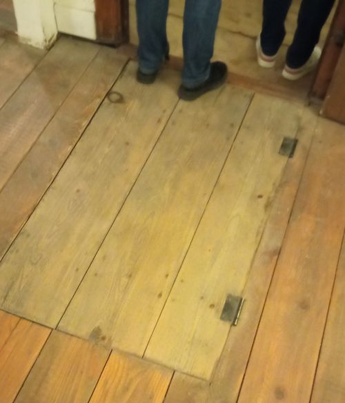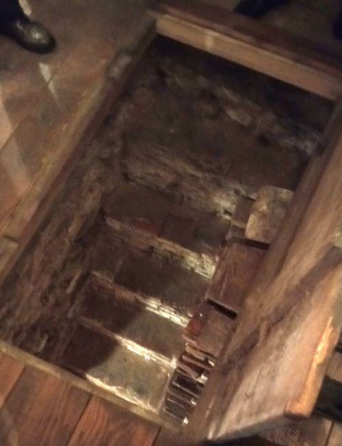 Dans la grande salle communautaire il y a une trappe qui donne accès à un escalier en pierre vers le sous-sol où se situe le bain rituel (Mikvé).