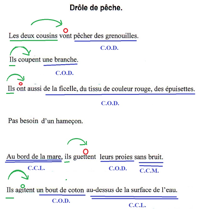 Dictée (Drôle de pêche) : le sujet et l'accord du verbe et du sujet, les C.O.D., C.O.I. et C.C.