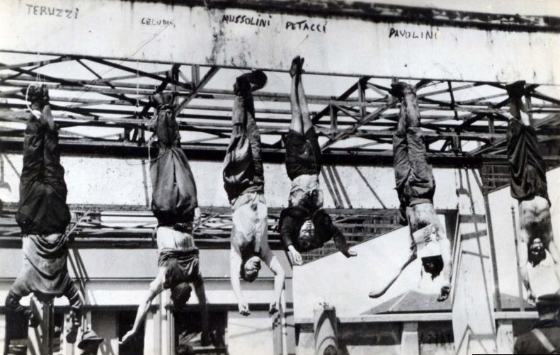 Cadavres de Mussolini et de sa maîtresse (au centre de l'image), entourés par plusieurs dignitaires fascistes.
