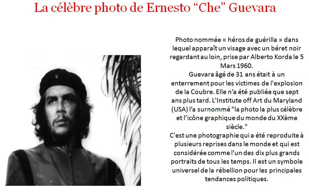 L’ex-photographe de mode, Alberto Korda, prenait des clichés de l’événement pour le journal Revolución , lorsqu’il aperçoit le Che Guevara qui s’avance pour regarder la foule. Korda immortalise le visage déterminé du rebelle sans avoir le temps de faire une mise au point complète.
