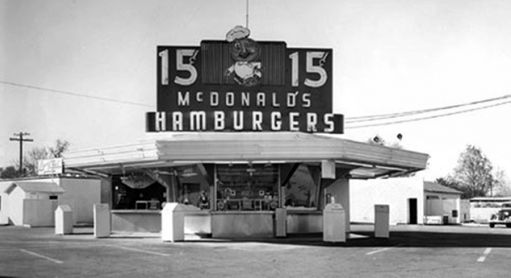Dans les années 40, les frères Mc Donald ouvraient leur premier restaurant appelé “McDonald’s Famous Barbeque”. Ils servaient surtout de la viande grillées et quelques hamburgers. En remarquant que le burger leur était plus rentable, ils firent le pari de modifier le resto familial en un fast-food vendant uniquement burgers, cheeseburgers, frites et sodas. Ils baptisèrent ce nouveau restaurant « Mc Donald’s ».