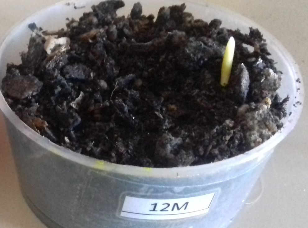- Le N° 12 M : une graine a commencé à germer dans 50 ml de terre sans lumière (dans le placard).