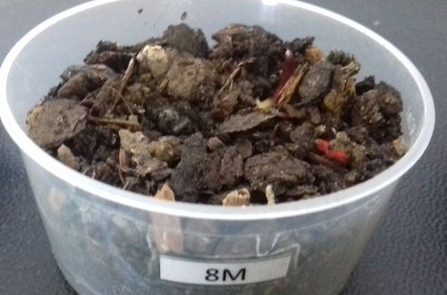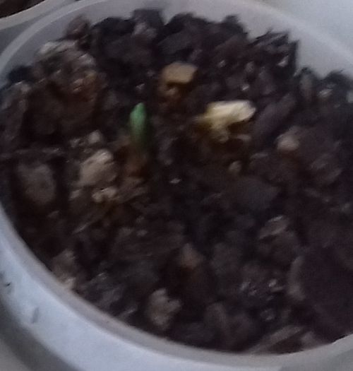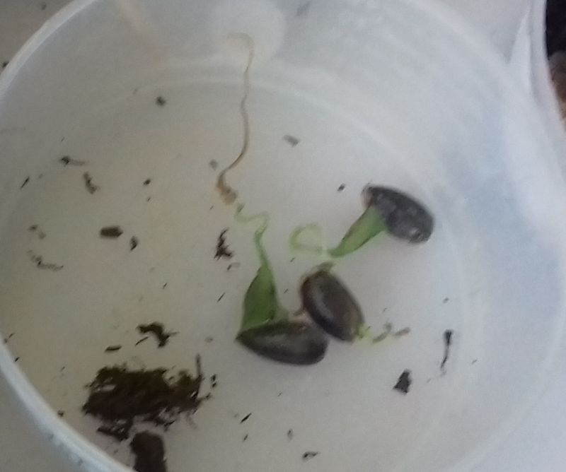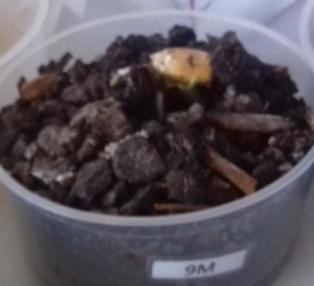 - Le N° 8 M : une graine a commencé à germer dans 50 ml de terre sur l'aquarium (35°C.).