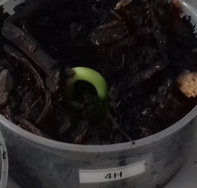 - Le N° 4 H : Un graine a commencé à germer dans 40 ml de terre et 10 ml de terreau.