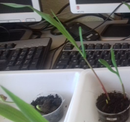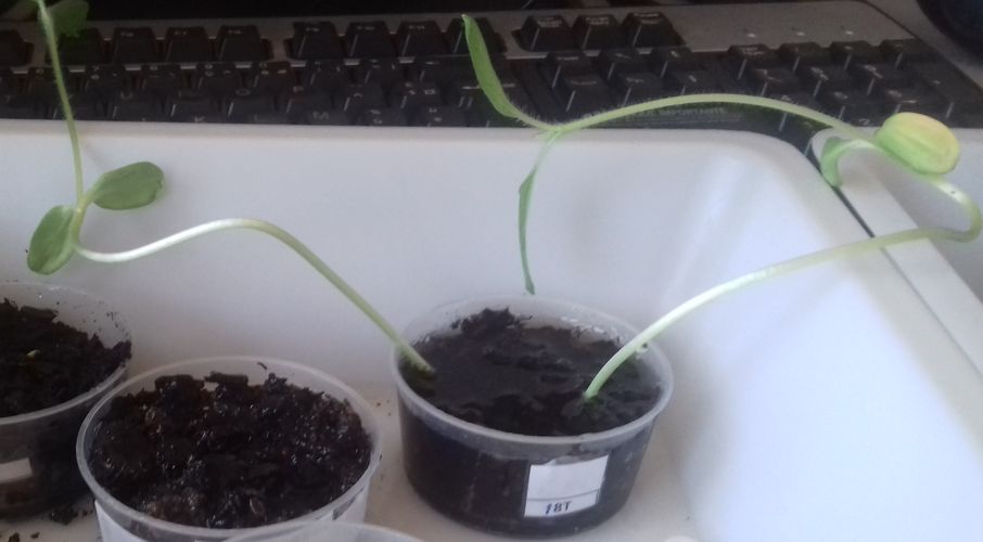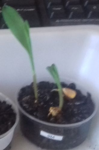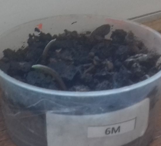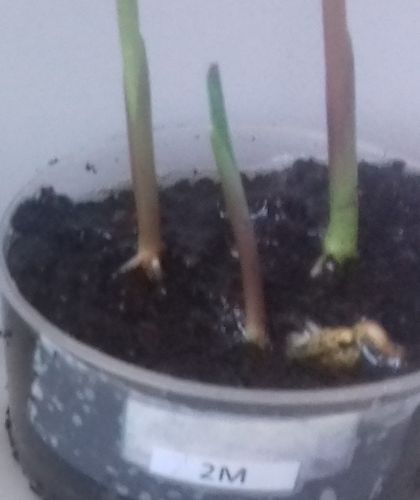- Le N° 2 M : deux graines continuent de germer et une commence à germer dans 40 ml de terre et 10 ml de terreau.
