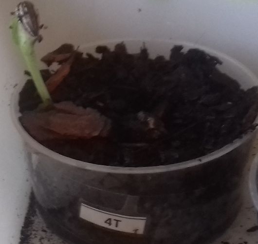 - Le N° 4 M : une graine continue de germer et deux autres commencent à germer dans 40 ml de terre et 10 ml de terreau.