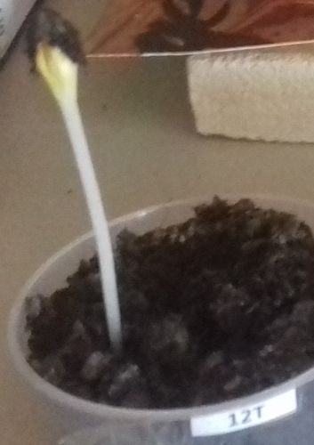 - Le N° 12 T : une graine continue de germer dans 50 ml de terre sans lumière (dans le placard).