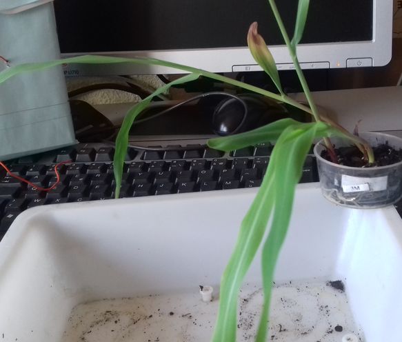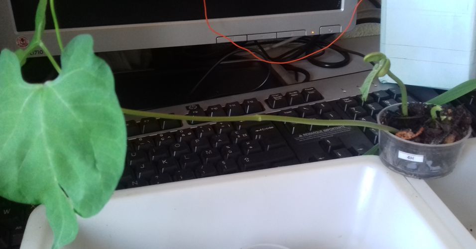 - Le N° 8 M : trois graines continuent de germer dans 50 ml de terre sur l'aquarium (35°C.).