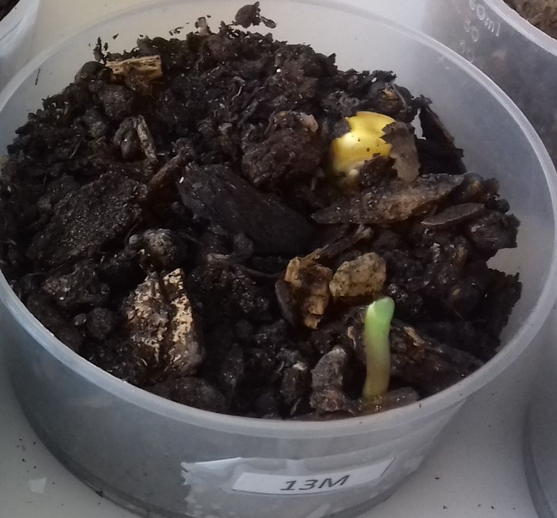 - Le N° 13 M : une graine a germé dans 50 ml de terre.