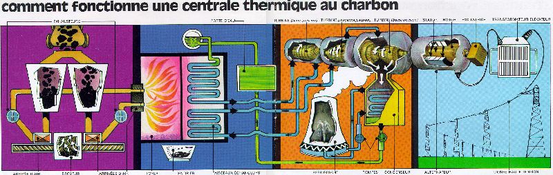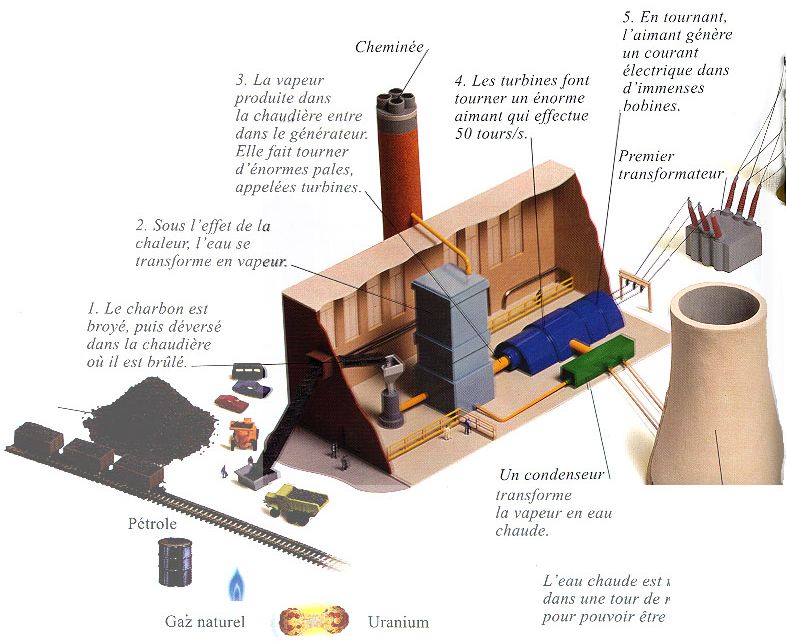 à un générateur. L’électricité est produite à partir d’une centrale thermique.