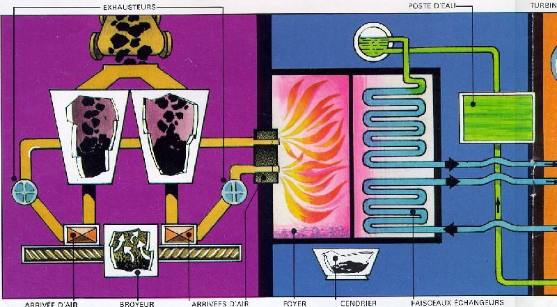 On déverse dans la chaudière, le charbon broyé qui y est brûlé. La chaleur produite par le charbon fait chauffer