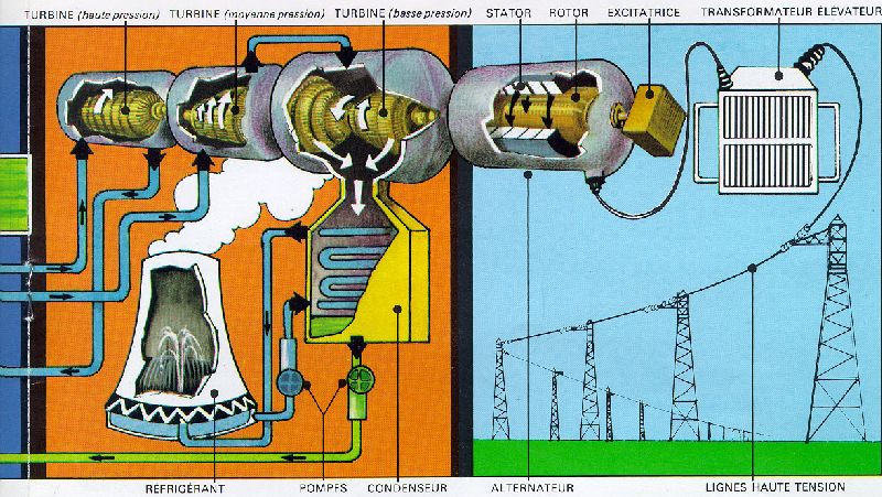 de l’eau qui se transforme en vapeur. La vapeur fait tourné des turbines.