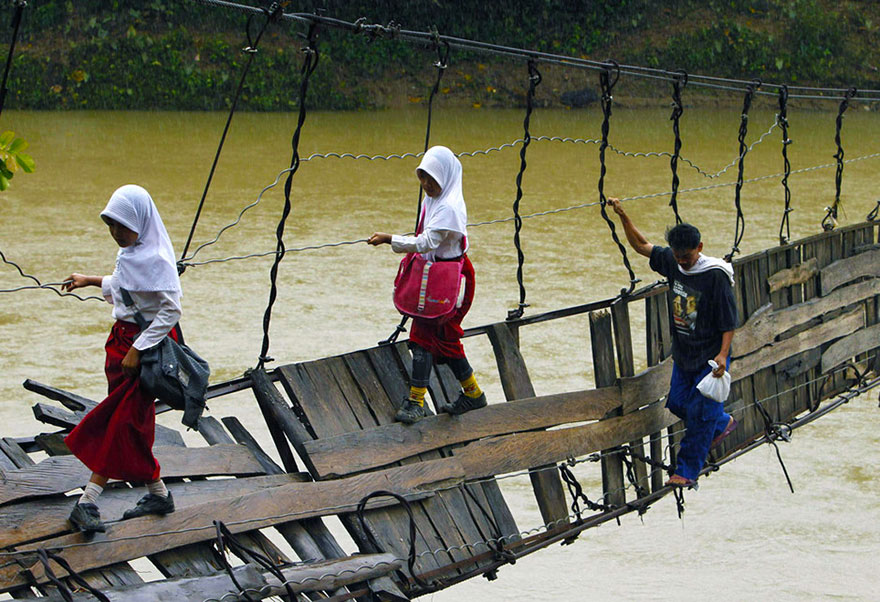 Des écolières traversent un pont suspendu et délabré à Lebrak en Indonésie.