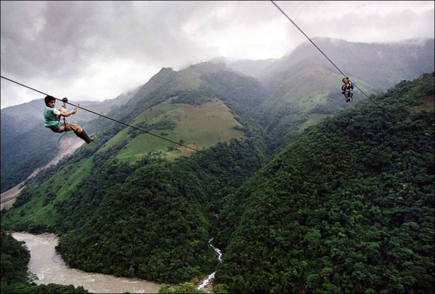 Des enfants contraints de se rendre à l’école en tyrolienne à 800 mètres au-dessus de la rivière Rio Negro en Colombie.