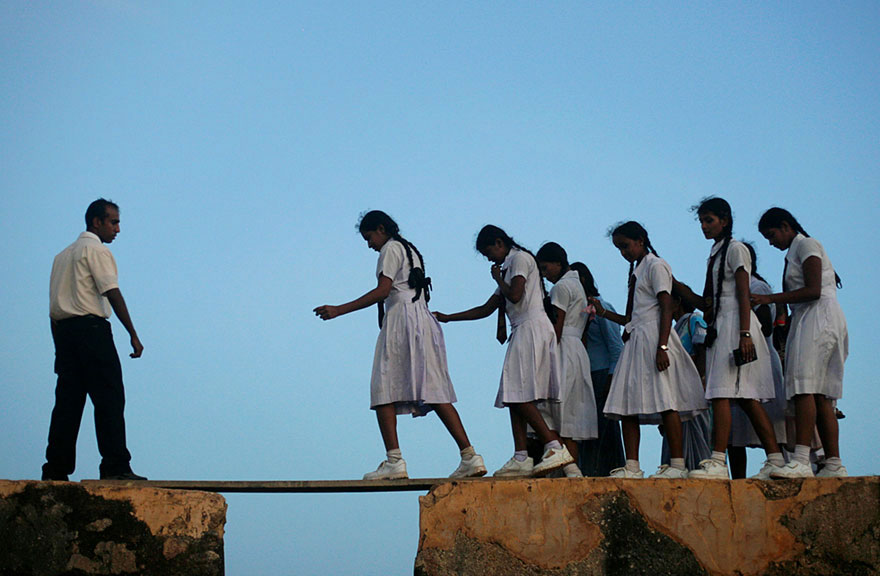 Des jeunes filles passent sur une planche posée sur un mur du XVIe siècle au Sri Lanka.