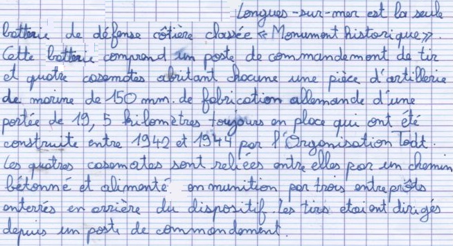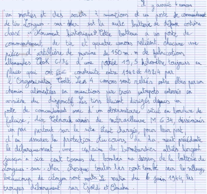Au cours de la nuit précédant le débarquement, une centaine de bombardiers alliés larguent jusqu’à six cent tonnes de bombes au dessus de la batterie de Longues-sur-Mer. La plupart des bombes tombent sur le village de Longues, entraînant la mort de nombreux civils. Au matin du 6 juin 1944, la batterie de Longues, située en haut d’une falaise culminant à soixante cinq mètres au dessus du niveau de la mer, ouvre le feu sur les troupes alliées qui débarquent sur les plages de Gold et de Omaha Beach.