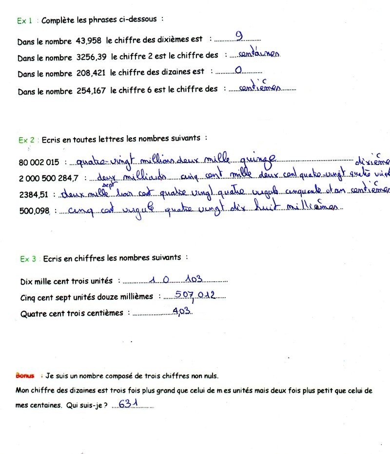 Contrôle N°1 : LES NOMBRES DECIMAUX