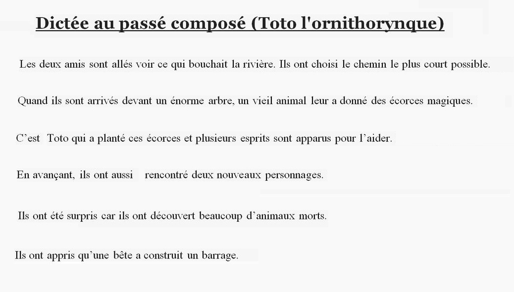 Dictée (Toto l'ornithorynque) : le sujet et l'accord du verbe et du sujet, les C.O.D., C.O.I. et C.C.