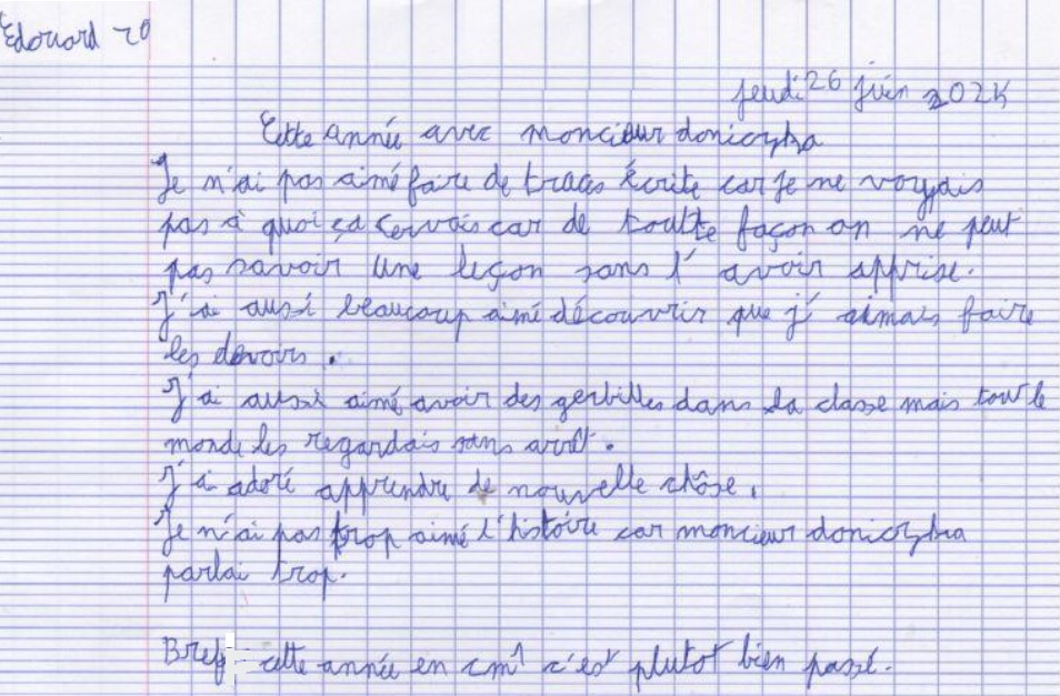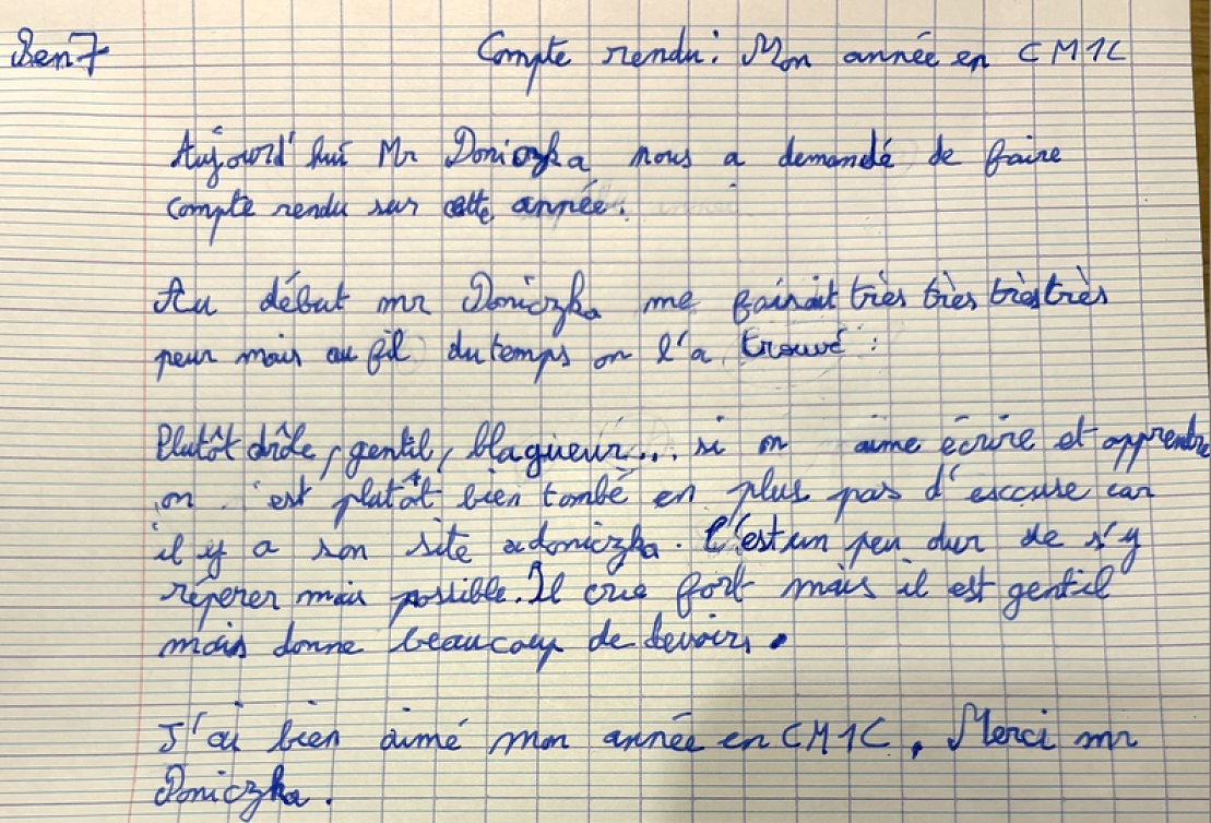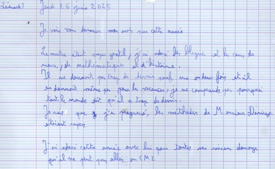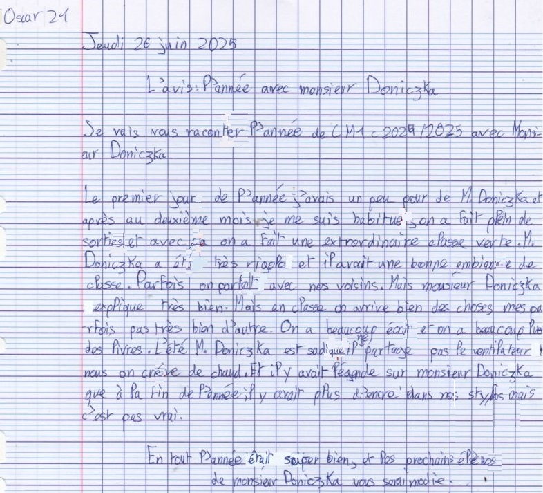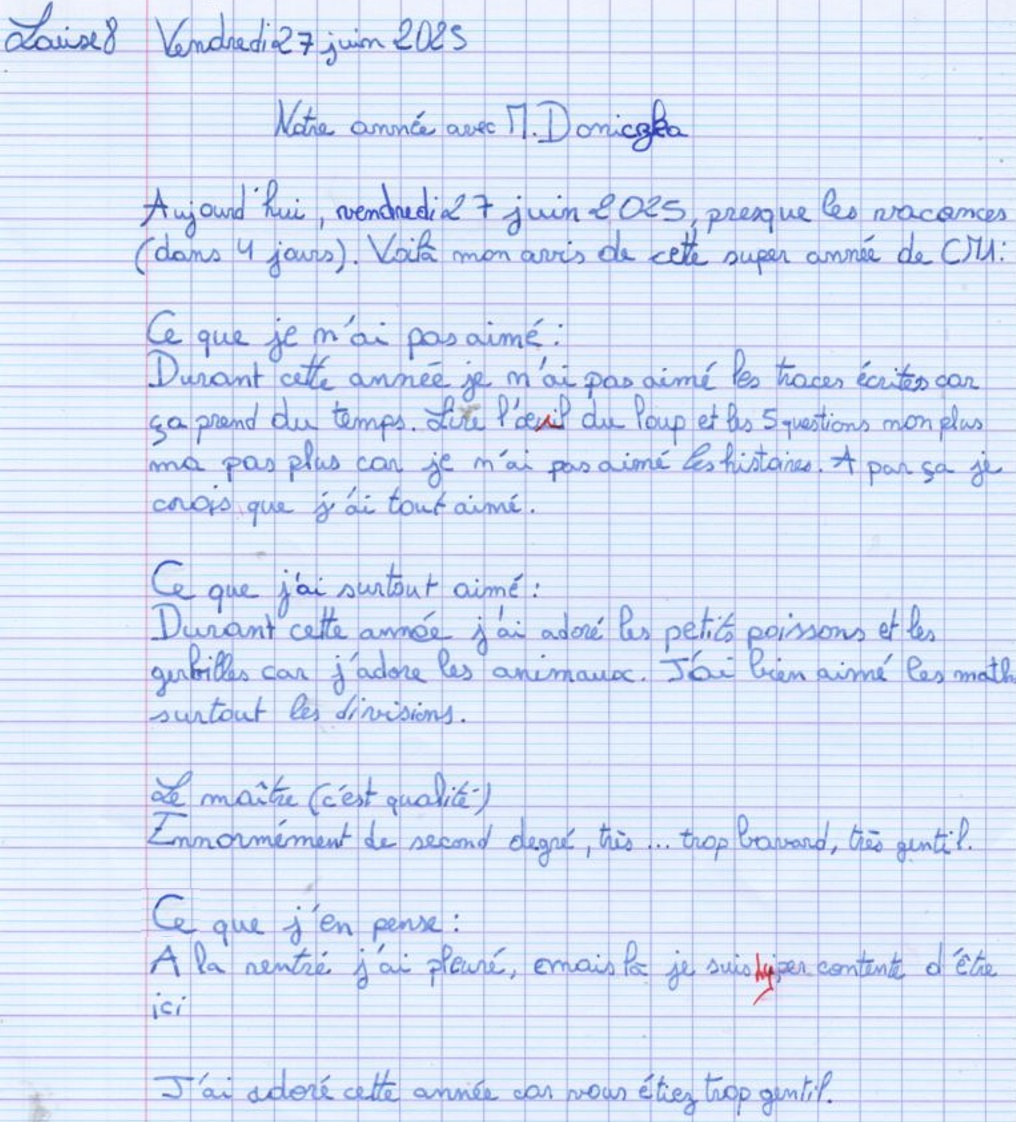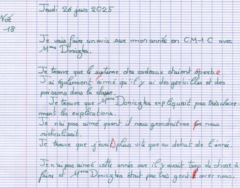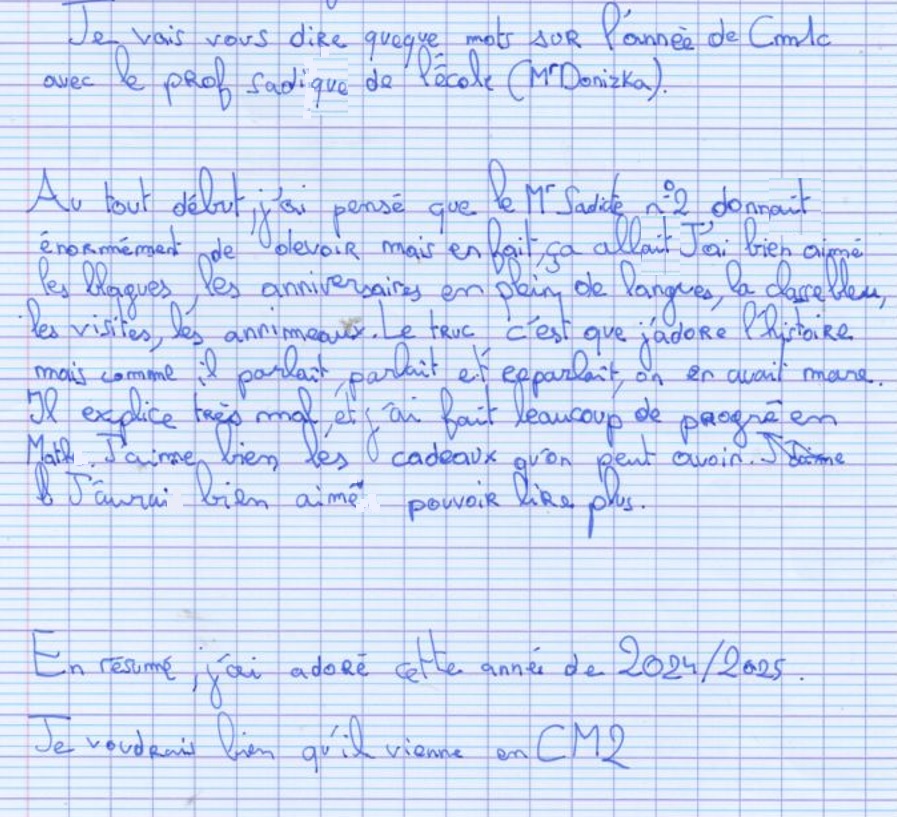 Avis des CM1c à propos de l'année scolaire 2024-2025 avec possibilité de rédaction sous anonymat