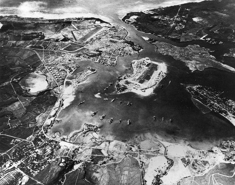 La rade de Pearl Harbor fin octobre 1941. Au centre, l'île Ford et l'Allée des cuirassés. En haut à gauche, l'aérodrome d'Hickam Field. A gauche, les réservoirs de carburant, le QG CINCPAC et la base de sous-marins.