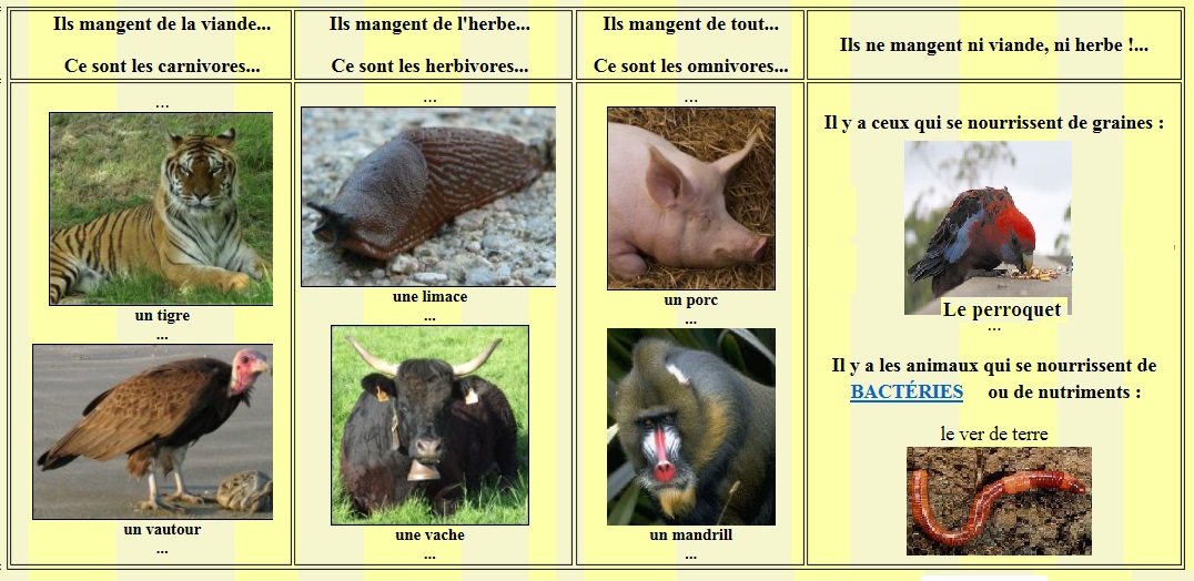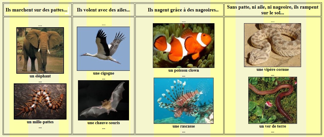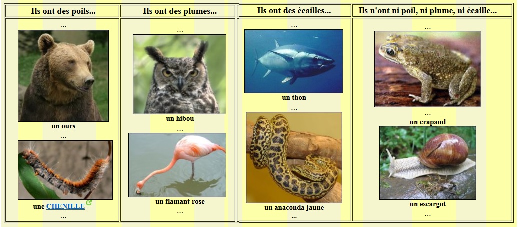 On peut classer les animaux selon leur apparence (poils, plumes, écailles, pas de poil, ni plume, ni écaille....) leur mode de déplacement (marchent avec des pattes, volent, nagent, sans patte, ni nageoire, ils rampent sur le sol...) ou leur alimentation (mangent de la viande, de l'herbe, de tout, ils mangent ni viande ni herbe...)